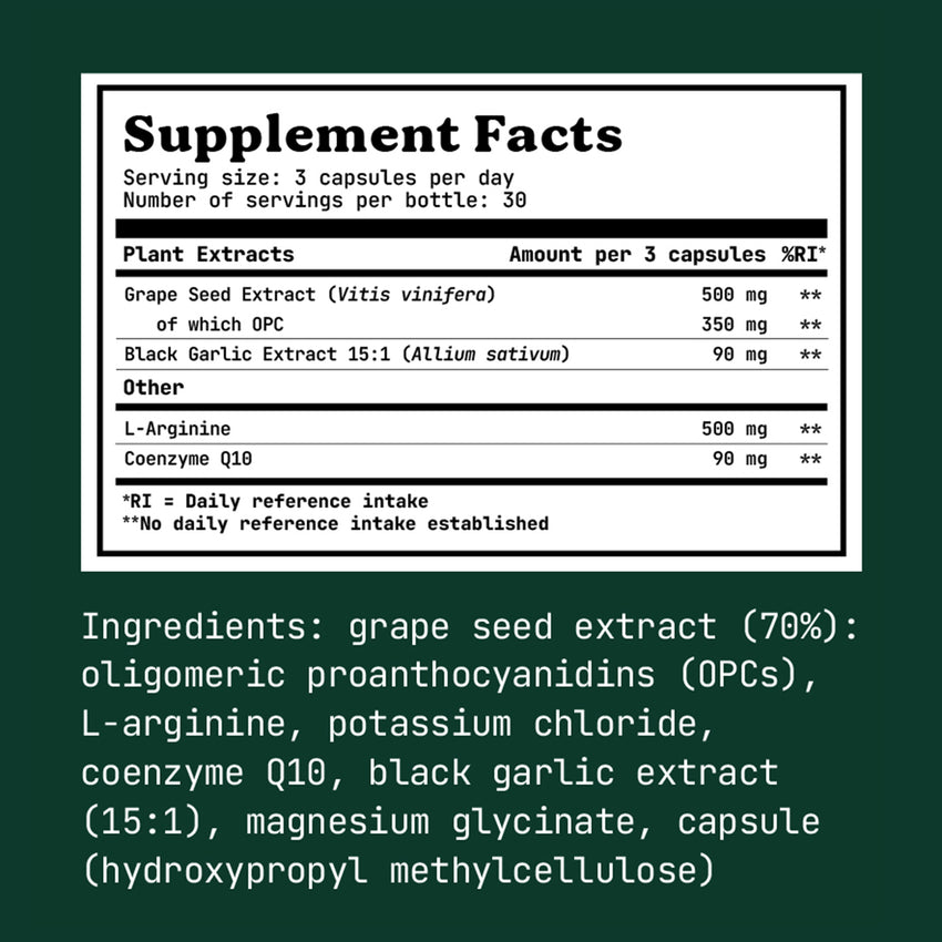 Heart Health blend combines high-quality OPC extracted from hand-picked French grapes with the bioactive coenzyme Q10 and wild black garlic. The exquisite special production is rounded off holistically with high-quality, organically bound potassium in order to specifically support blood pressure. We source our grape seeds from selected, strictly controlled French growing areas. The natural essence OPC extracted from grape seeds has long been known as a natural and powerful antioxidant and is used in numerous areas thanks to its versatile effects. This secondary plant substance was also included in the design of our synergistic blood pressure complex - just like the essential coenzyme Q10. Black garlic achieves its potent power and increased content of valuable antioxidants through a sustainable fermentation process in which both temperature and humidity are closely monitored. Through the subsequent extremely gentle extraction process, Heart Health blend achieves a particularly high dosage of garlic in the form of an extraordinary 15:1 extract - thus 90 mg (per daily dose) are obtained from 1,350 mg of the purest fermented garlic. Through independent laboratory tests, the natural substances are always subject to the strictest controls to ensure the highest possible quality of the composition. The focus is on the utmost purity, sustainability and naturalness in every product, without genetic engineering or animal testing. That's why you won't find any unwanted additives or colorants in Heart Health blend, but only sensible combinations of natural substances in a highly pure and vegan form.