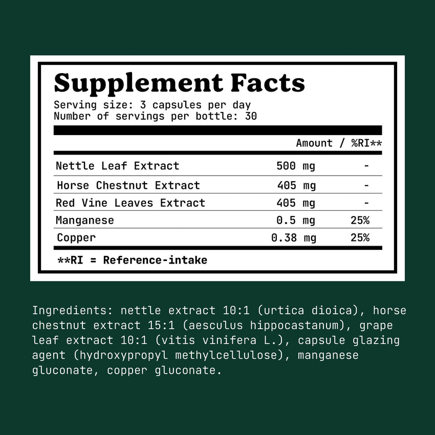 This blend is a multi-component preparation that essentially consists of three herbal extracts: NETTLE EXTRACT, HORSE CHESTNUT EXTRACT and RED VINE LEAF EXTRACT. All three plant substances are well-known ingredients in natural nutritional supplements and together form a very effective and synergistic complex. The recipe is rounded off with the essential trace elements MANGANESE and COPPER. Thanks to a gentle extraction process, with which we achieve concentration ratios of 10:1 (nettle extract, vine leaf extract) or even 15:1 (horse chestnut extract), our Water Balance blend capsules have a very high dosage compared to similar products on the market.